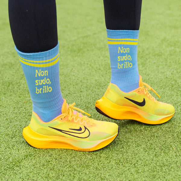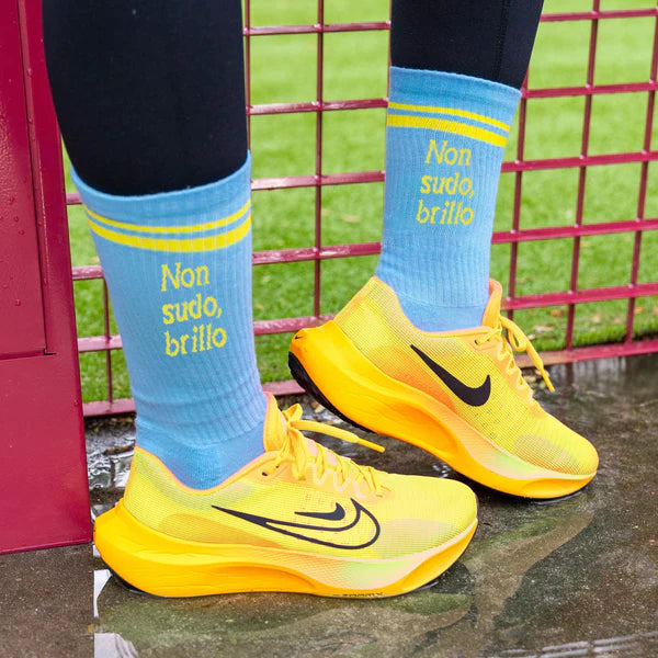 Lascia il segno con questi calzini originali 🧦 con la scritta in italiano “non sudo, brillo” con cui farai capire che quello che hai sulla fronte non è sudore, è la lucentezza che emani✨! Indossa calzini blu egialli in palestra, per giocare a paddle tennis o nella vita di tutti i giorni per aggiungere un tocco divertente ai tuoi outfit.