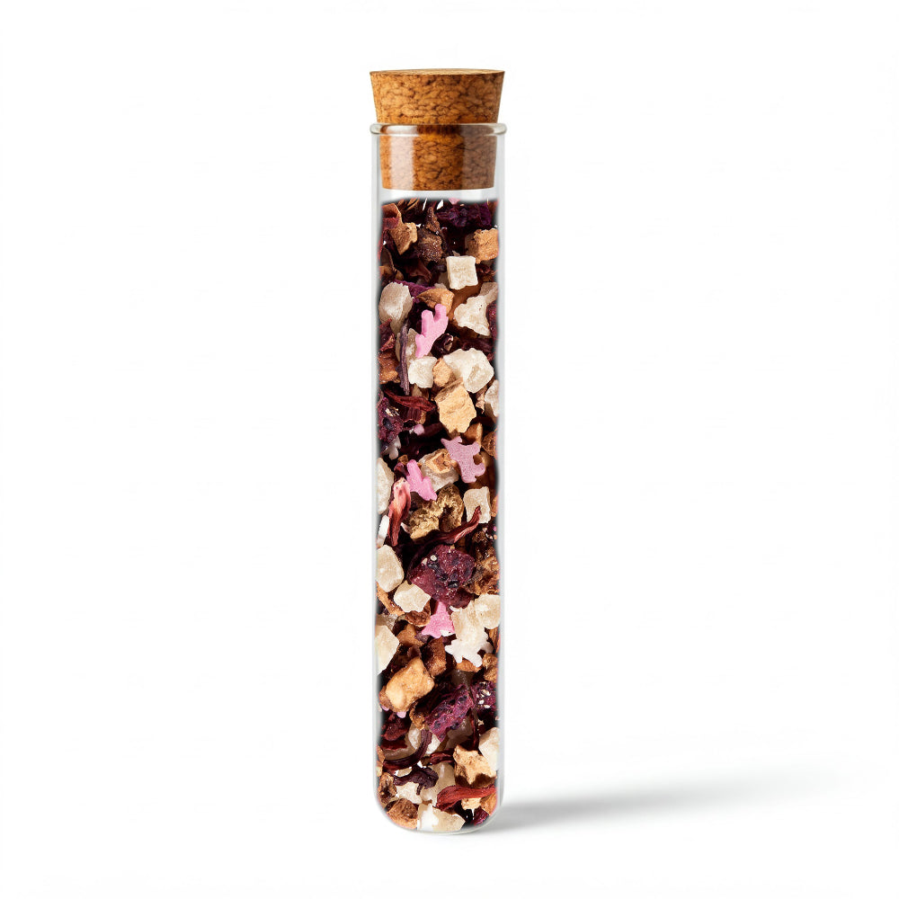 Unicorni di zucchero colorati galoppano tra cubetti di ananas dolce, cubetti di frutto del drago viola e granuli di yogurt alla fragola luccicanti. Lamponi maturi e succosi e accenti di melograno fruttati e aspri, delicatamente sottolineati da un po’ di ibisco donano un piacere di tè alla frutta dolce e rinfrescante. Gustato freddo, è semplicemente delizioso.