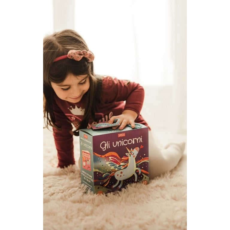 Una scatola abbellita da dettagli iridescenti che contiene un libro di 10 pagine, un puzzle di 40 pezzi e 10 figure sagomate del mondo dei pirati da assemblare e posizionare sul puzzle, per imparare a riconoscere e associare elementi e parole.
