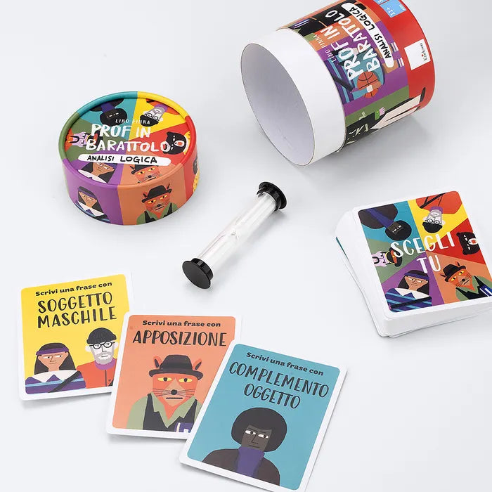 Il gioco perfetto per trasformare l’analisi logica in un’attività coinvolgente e interattiva: Prof in barattolo è progettato per aiutare ragazzi e ragazze dagli 11 anni in su a riconoscere soggetti, predicati e complementi in modo dinamico e divertente. Con meccaniche semplici ma efficaci, stimola la riflessione e il ragionamento, rendendo l’apprendimento della sintassi un’esperienza pratica e appassionante. Si può giocare in singolo o in squadra, favorendo la collaborazione e il confronto.