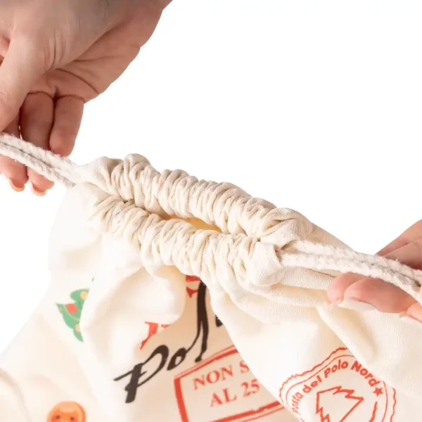 Realizzato in cotone e poliestere, con chiusura a coulisse e capienza fino a 8 kg, è l’accessorio ideale per raccogliere doni, sorprese e biglietti pieni di magia. Riutilizzabile e decorativo, porta un tocco di autenticità sotto l’albero.