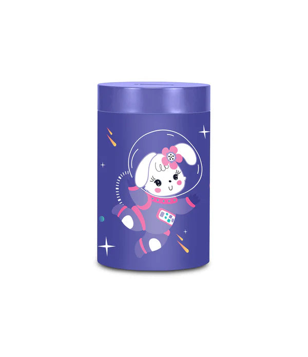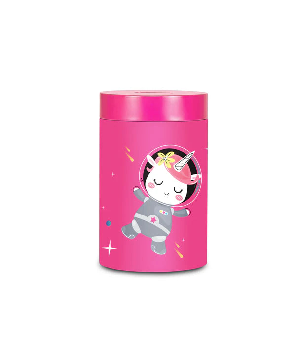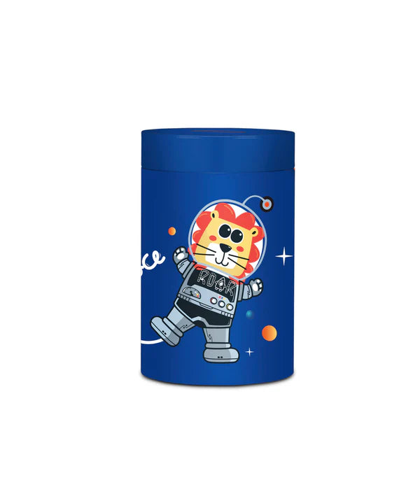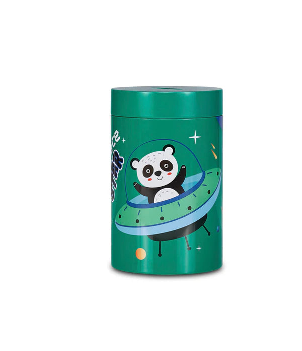 - Salvadanaio in latta, leggero e resistente, per iniziare i più piccoli al risparmio. Rimuovendo il coperchio superiore può essere utilizzato anche come portamatite.