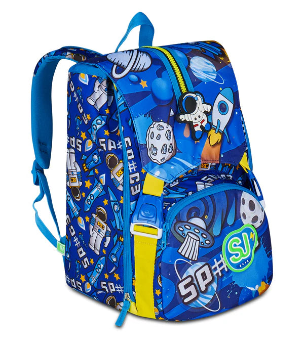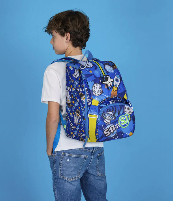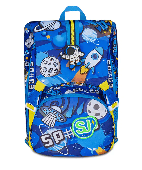 Ciao! Sono lo spaziale FLYROCKET BOY, lo zaino estensibile SJ GANG con il quale andare a scuola e giocare! Estrai le FIAMME da sotto la pattina e fai volare l’ ASTRONAUTA scorrendo su e giù la zip! Ho un doppio scomparto spazioso, di cui puoi aumentare facilmente la capienza tramite le zip laterali per poter accogliere e distribuire in modo ottimale libri, quaderni e tutto ciò che ti serve per la tua giornata, potendo sfruttare anche la tasca frontale. Inoltre, sono davvero comodo da indossare sulle spalle, grazie a schienale e spallacci confortevoli. In più, il fondo integrato mantiene la mia struttura inalterata, garantendo la stabilità del contenuto anche a pieno carico.